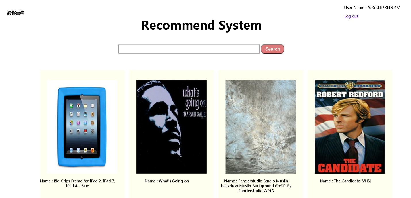 前端页面包含四个页面,用户登陆页面,搜索页面,商品详细信息,以及根据商品推荐的商品页面。